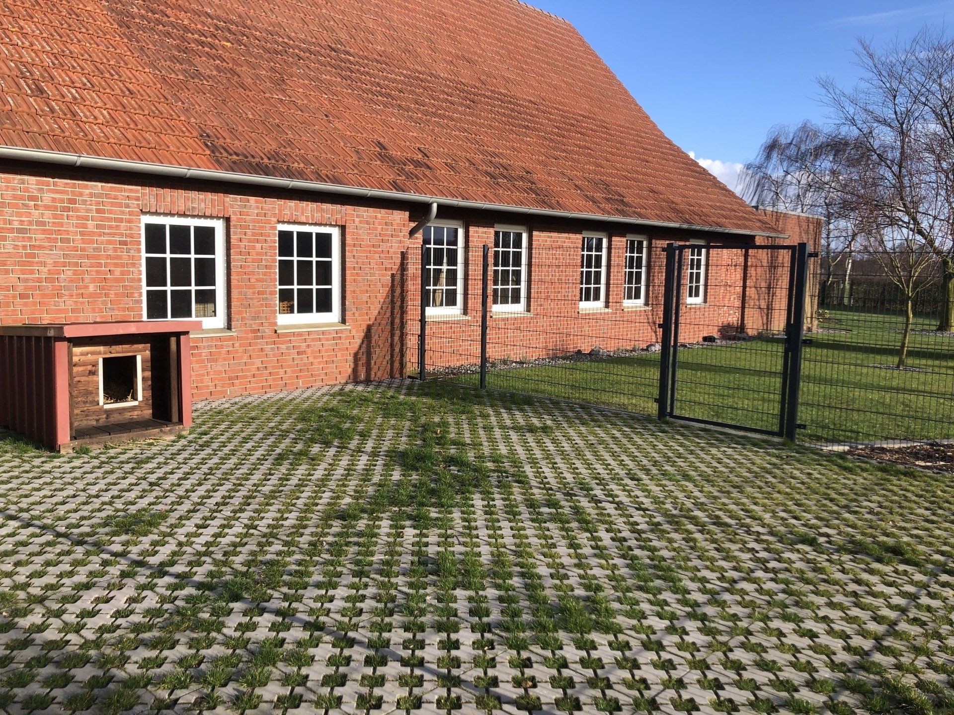 Sobald sie groß genug sind um auszuziehen, leben sie in einem Zwinger mit 80 m2 eingezäunten Auslauf. Die Rüden Pius und "Alfons" haben großen Spaß daran mit den Welpen zu spielen und bei der Erziehung mitzuhelfen.